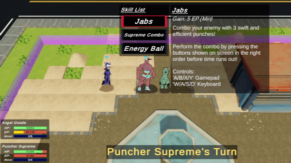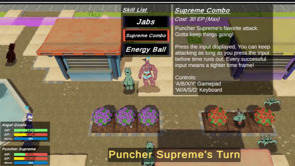 My role on this project was to come up with minigames, then make them the appropriate difficulty, design the combat aspects of characters, and balance them. I started by coming up with ideas for the minigames that would fit with the characters that we wanted in the game. For example, there is the Puncher Supreme which was based on anime martial artists and pro wrestlers. For this character, the minigames were made to emulate elements of fighting games like combos or special attack inputs. The shown attack is his basic attack which plays off of throwing quick attacks in fighting games.