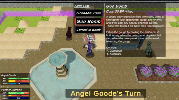 One of the big things that we wanted for the game was that the player could interact with every turn that would be taken. This includes both player and enemy turns. While this may sound simple it was a factor that led to many design decisions including the max party size of four. This is because it is the number of buttons easily pressed by a player at one time. That was important to know as we wanted area attacks in our game and the player to be able to lower damage from incoming attacks. As such it was both a limiting factor but also one that gave us a clear outline of what would feel good number to control for the player.